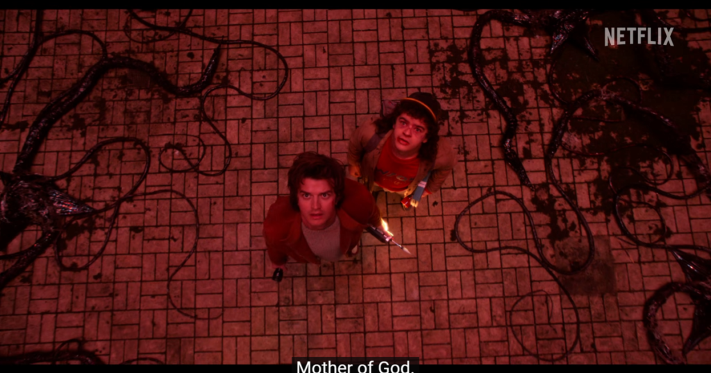 In this Stranger Things final season Part 2 episode, the group has discovered the horrifying truth: Hawkins Lab is protected by a fleshy, circular barrier that surrounds the entire town. This barrier serves two purposes – it shields Vecna’s lair from detection and prevents something far more terrifying from breaking through from Dimension X. The team realizes they must weaken this barrier to reach and rescue the 12 children that Vecna has kidnapped and imprisoned within his mind.